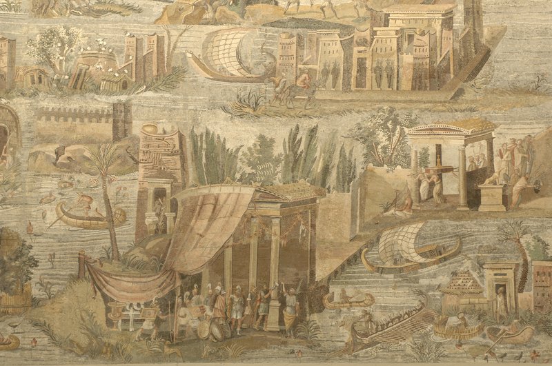 Arte alessandrina-italica, Mosaico nilotico, c. II sec. a.C., Palestrina Museo archeologico prenestino, palazzo Colonna Barberini. Dettaglio di soldati sacrificanti, palazzo egizio, veliero, giunche, triremi, pesca, processione